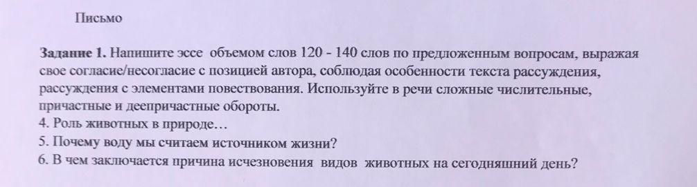 Письмо Задание 1. Напишите эссе объемом слов 120 - 140 слов по предложенным вопросам, выражая свое согласие/несогласие с позицией автора, соблюдая особенности текста рассуждения, рассуждения с элементами повествования. Используйте в речи сложные числительные, причастные и деепричастные обороты. 4. Роль животных в природе... 5. Почему воду мы считаем источником жизни? 6. В чем заключается причина исчезновения видов животных на сегодняшний день?