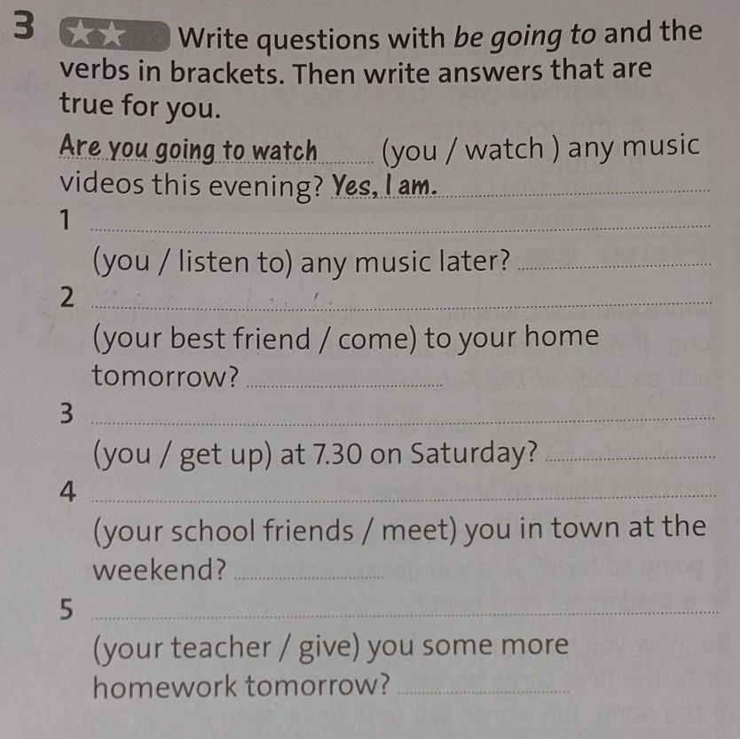 5. 45- e a hit? ay? eet? if 3 ★★ Write questions with be going to and the verbs in brackets. Then write answers that are true for you. Are you going to watch videos this evening? Yes, I am. 1 (you / listen to) any music later? 2 (you/watch) any music 4 3 (you / get up) at 7.30 on Saturday? 5 (your best friend / come) to your home tomorrow?............. (your school friends / meet) you in town at the weekend? (your teacher / give) you some more homework tomorrow?