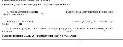 СРОЧНО дам 30б 2. Бос орындарға қажетті сөздер мен сөз тіркестерiн койыныз. А. Астана аталмыш саладагы тиiмдi аланга айналды. [1] В.Турлi мемлекеттердің [1] жасақтамалар мен үрдiстердiң көрінісі үшін қатысты ұстанымдары, көзқарастары ұнады. с. Дуниенің әр бұрышынан келген қонақтарСарыарқанын тәсiндегi «Этноауыл» ұлттық мәдени кешенi [1] танысты.