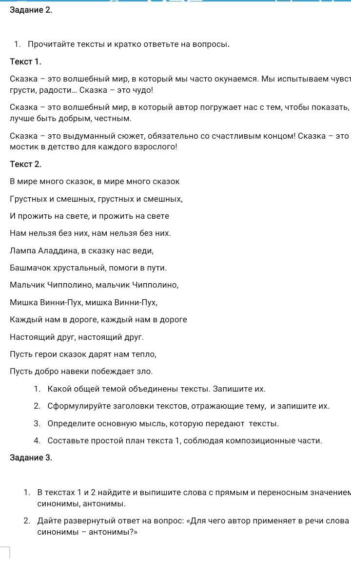 Задание 2. 1. Прочитайте тексты и кратко ответьте на вопросы. Текст 1. Сказка - это волшебный мир, в который мы часто окунаемся. Мы испытываем чувст грусти, радости... Сказка - это чудо! Сказка - это волшебный мир, в который автор погружает нас с тем, чтобы показать, лучше быть добрым, честным. Сказка - это выдуманный сюжет, обязательно со счастливым концом! Сказка - это мостик в детство для каждого взрослого! Текст 2. В мире много сказок, в мире много сказок Грустных и смешных, грустных и смешных, И прожить на свете, и прожить на свете Нам нельзя без них, нам нельзя без них. Лампа Аладдина, в сказку нас веди, Башмачок хрустальный, помоги в пути. Мальчик Чипполино, мальчик Чипполино, Мишка Винни-Пух, мишка Винни-Пух, Каждый нам в дороге, каждый нам в дороге Настоящий друг, настоящий друг. Пусть герои сказок дарят нам тепло, Пусть добро навеки побеждает зло. 1. Какой общей темой объединены тексты. Запишите их. 2. Сформулируйте заголовки текстов, отражающие тему, и запишите их. 3. Определите основную мысль, которую передают тексты. 4. Составьте простой план текста 1, соблюдая композиционные части. Задание 3. 1. В текстах 1 и 2 найдите и выпишите слова с прямым и переносным значением синонимы, антонимы. 2. Дайте развернутый ответ на вопрос: «Для чего автор применяет в речи слова синонимы - антонимы?>>
