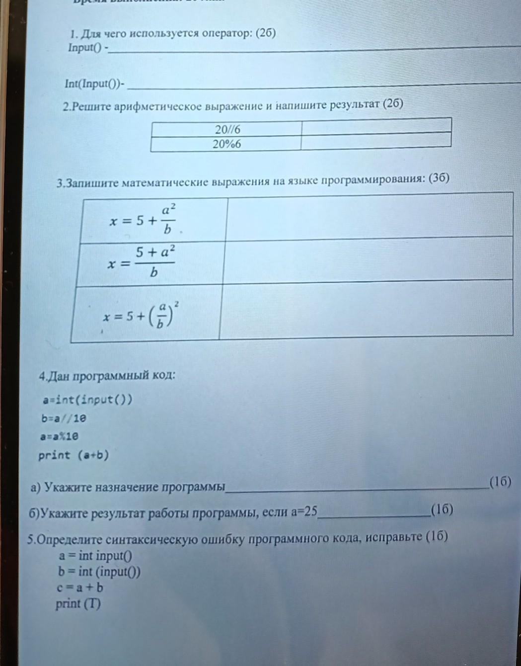 1. Для чего используется оператор: (26) Input() - Int(Input()) - 2.Решите арифметическое выражение и напишите результат (26) 3.Запишите математические выражения на языке программирования: (36) a² b 5+a² x = 5+ x = 5 + 5+ (1) b=a//10 a-a 10 print (a+b) 4.Дан программный код: a=int(input()) 20//6 20%6 M а) Укажите назначение программы 5)Укажите результат работы программы, если а=25 (16) 5.Определите синтаксическую ошибку программного кода, исправьте (16) a = int input() b = int (input()) c=a+b print (T) (16)
