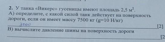 M 2. У танка «Викерс» гусеницы имеют площадь 2,5 м². А) определите, с какой силой танк действует на поверхность дороги, если он имеет массу 7500 кг (g=10 Н/кг) в) вычислите давление шины на поверхность дороги
