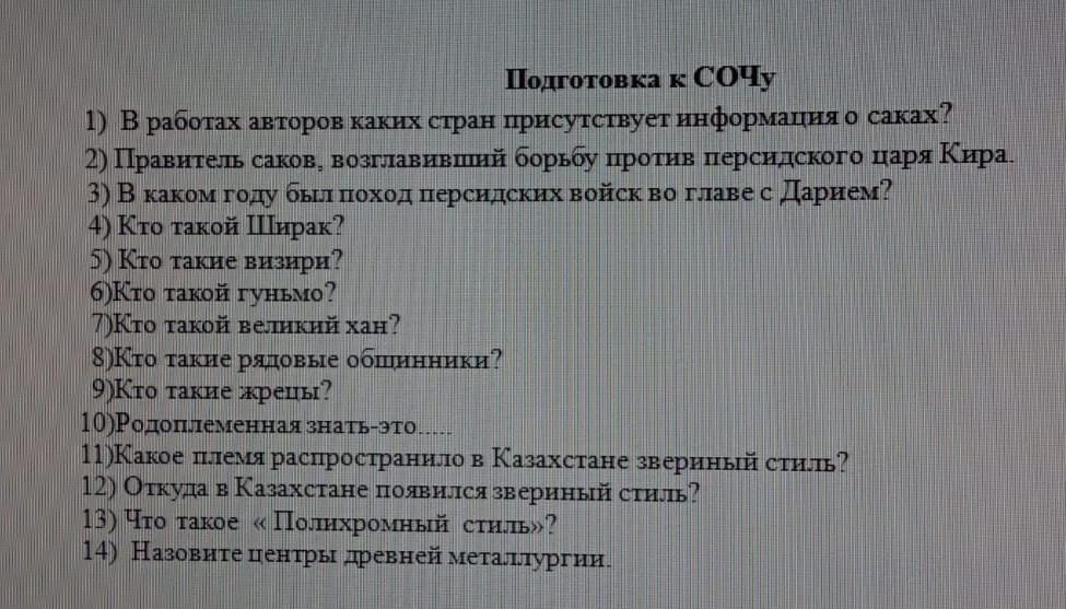 Подготовка к СОЧу 1) в работах авторов каких стран присутствует информация о саках? 2) Правитель саков, возглавивший борьбу против персидского царя Кира. 3) В каком году был поход персидских войск во главе с Дарием? 4) Кто такой Ширак? 5) Кто такие визири? 6) Кто такой гуньмо? 7 Кто такой великий хан, 8) Кто такие рядовые общинники, 9)Кто такие жрецы? 10) Родоплеменная знать-это.. 11 Какое племя распространило в Казахстане звериный стиль? 12) Откуда в Казахстане появился звериный стиль? 13) Что такое «Полихромный стиль»? 14) Назовите центры древней металлургии.