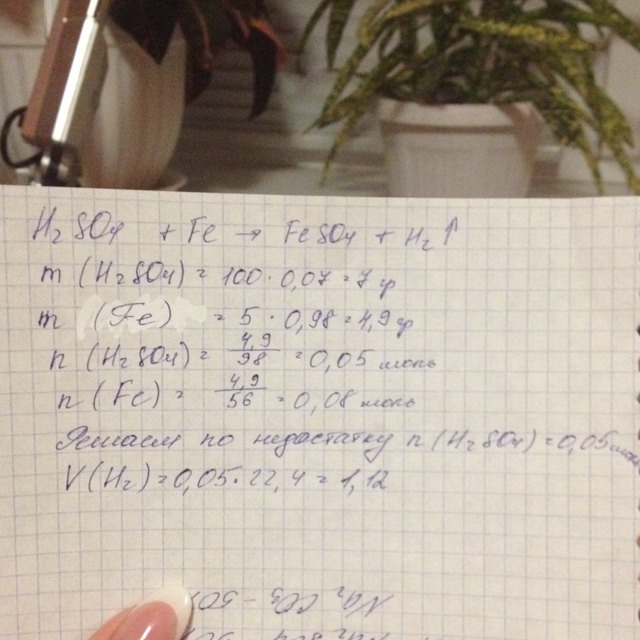 в раствор серной кислоты массой 100 грамм и массовой долей 7% опустили образец стали массой 5 г содержащий в своём составе 98%железа. Вычислите объём (н.у) выделившегося водорода