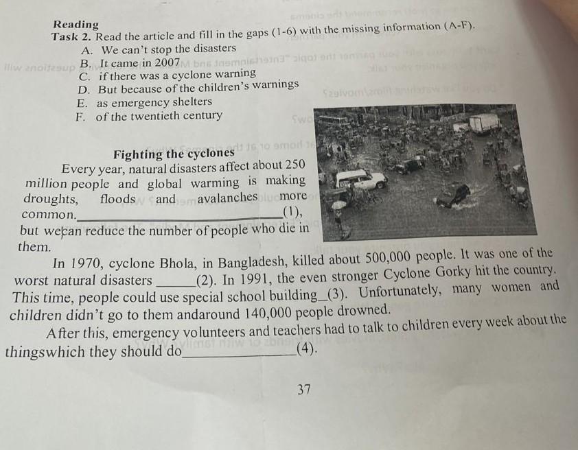 Reading Task 2. Read the article and fill in the gaps (1-6) with the missing information (A-F). A. We can't stop the disasters B. It came in 2007 C. if there was a cyclone warning D. But because of the children's warnings E. as emergency shelters F. of the twentieth century Fighting the cyclones Every year, natural disasters affect about 250 million people and global warming is making droughts, floods and avalanches common. more (1), but wecan reduce the number of people who die in them. In 1970, cyclone Bhola, in Bangladesh, killed about 500,000 people. It was one of the worst natural disasters (2). In 1991, the even stronger Cyclone Gorky hit the country. This time, people could use special school building (3). Unfortunately, many women and children do to them andaround 140,000 people drowned. Af this, ergency volunteers and teachers had to talk to child eve week about the thingswch they uld do (4). 37