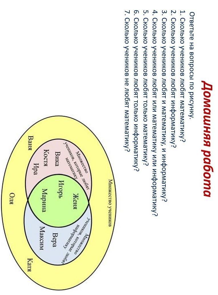 Ответьте на вопросы по рисунку. 1. Сколько учеников любят математику? 2. Сколько учеников любят информатику? 3. Сколько учеников любят и математику, и информатику? 4. Сколько учеников любят или математику или информатику? 5. Сколько учеников любят только математику? 6. Сколько учеников любят только информатику? 7. Сколько учеников не любят математику? Множество учеников, которые любят математику Вика Костя Ваня Множество учеников Ира Женя Игорь Марина Оля Множество учеников, которые любят информатику Bepa Максим Катя