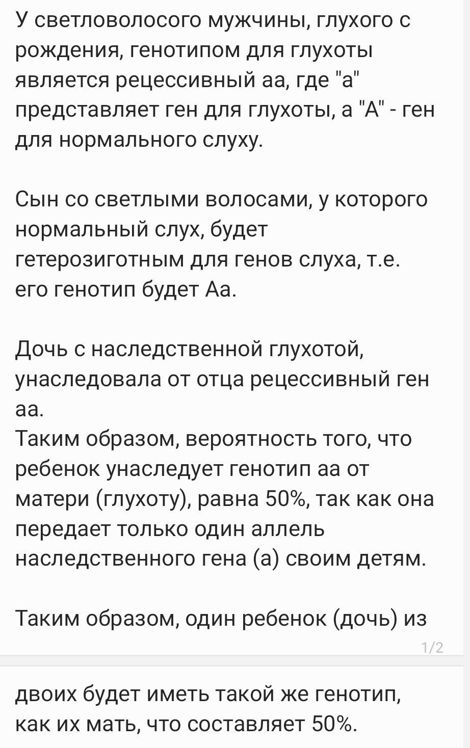 у светловолосого мужчины, глухого с рождения, есть темноволосый сын с нормальным слухом и дочь со светлыми волосами, у которой проявляется наследственная глухота; определите, сколько детей в семье будут иметь такой же генотип, как их мать (%)?