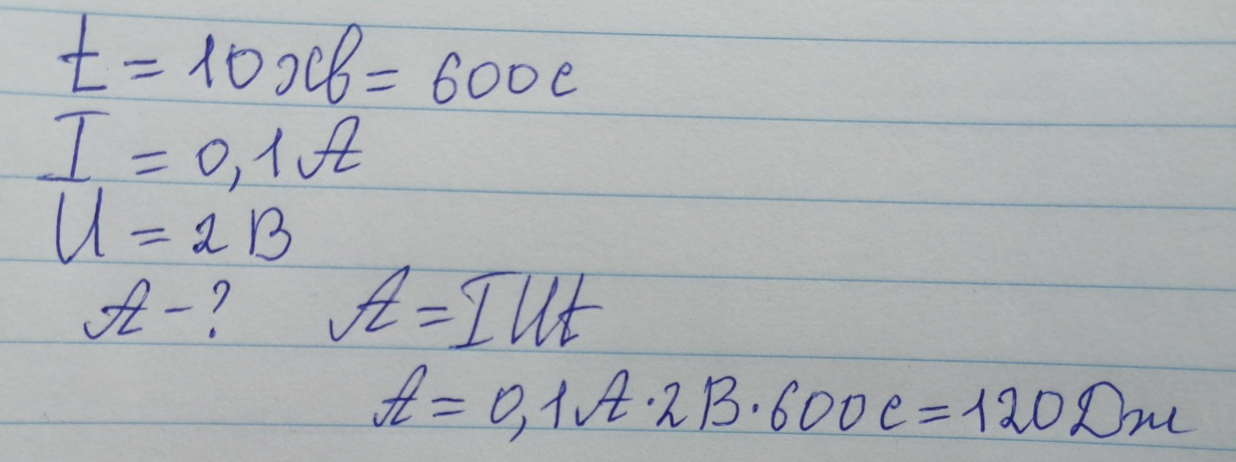 Яку роботу виконує струм у лампі протягом 10 хвилин якщо сила струму в ній 0,1 а при напрузі 2 вольта