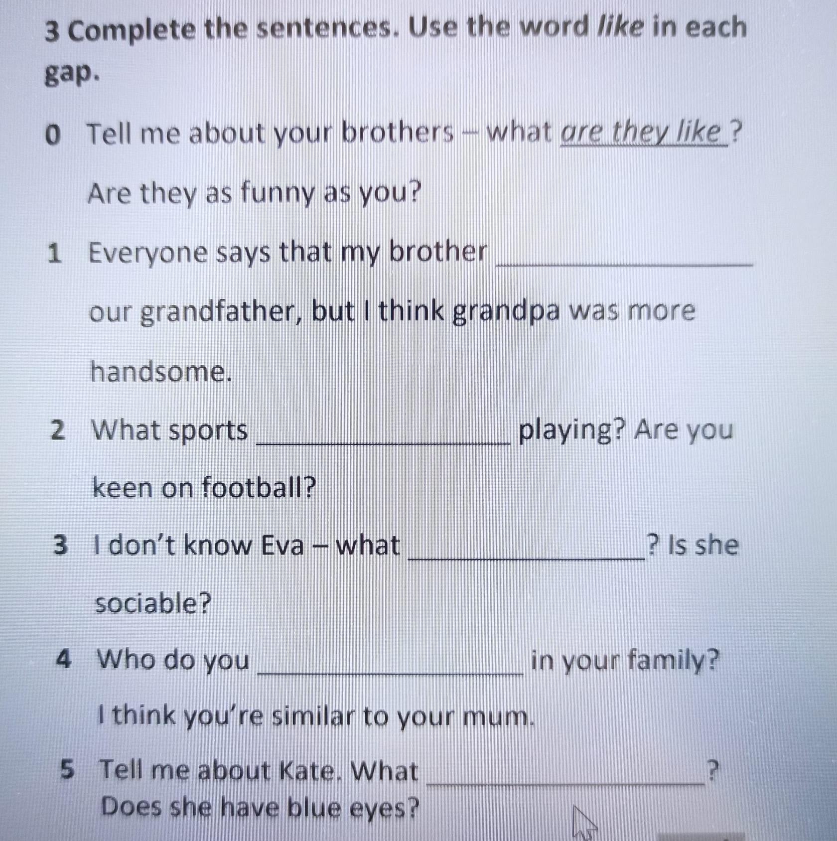 Are they as funny as you? 1 Everyone says that my brother our grandfather, but I think grandpa was more handsome. 2 What sports keen on football? 3 I don't know Eva - what sociable? 4 Who do you playing? Are you ? Is she in your family?