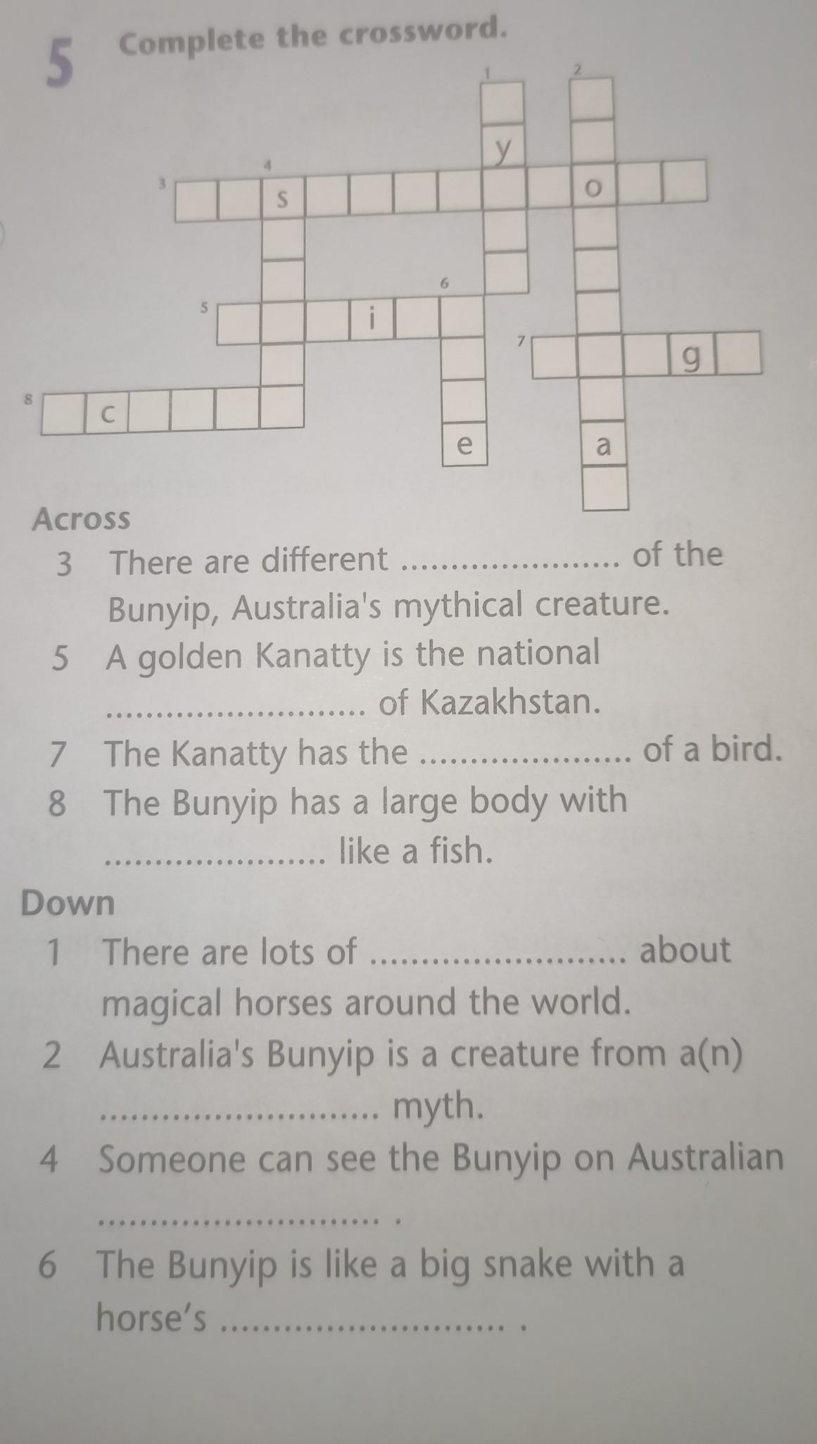 помогите пжпж Complete the crossword. Across 3 There are different Bunyip, Australia's mythical creature. A golden Kanatty is the national of Kazakhstan. a 7 The Kanatty has the 8 The Bunyip has a large body with like a fish. ... of the g ...... of a bird. Down 1 There are lots of ......... .... about magical horses around the world. Australia's Bunyip is a creature from a(n) ... myth. Someone can see the Bunyip on Australian 4 6 The Bunyip is like a big snake with a horse's.......