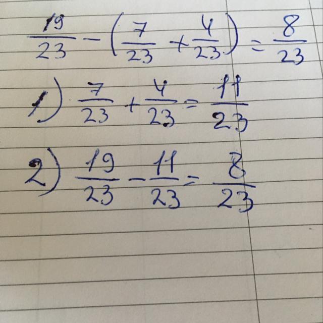19/23 - (7/23 + 4/23) = 19/23 - 11/23 = 8/23