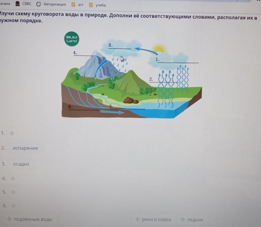 Изучи схему круговорота воды в природе. Дополни её соответствующими словами, располагая их в нужном порядке.BILIM LAND 4. 3. 1. 2. 5. 6. 1. 2. 3. 4. 5. 6. подземные воды испарение осадки реки и озера ледник солнечный свет