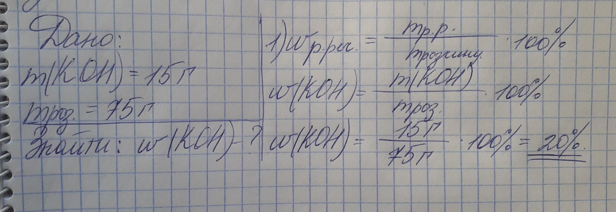 15 г калій гідроксиду розчинили у воді, отримавши 75 г розчину. Обчисли масову частку (%) розчиненої речовини: