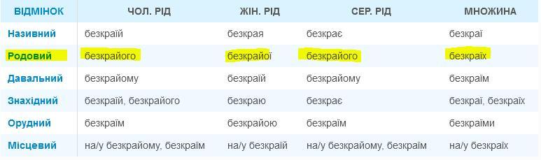 Знайдіть правильну форму прикметника в родовому відмінку однини: а) безкрайого; б) безкраего; в) безкраïго; г) безкраего.