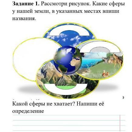 Задание 1. Рассмотри рисунок. Какие сферы у нашей земли, в указанных местах впиши названия. Какой сферы не хватает? Напиши её определение