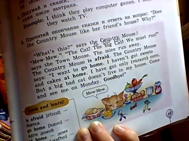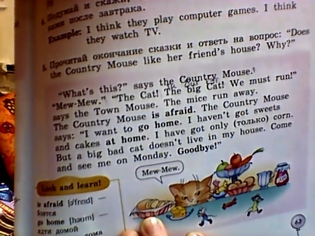 "Вотс зис" сэйс зе сентри маус " мяу мяу" зе кэт! Зэ биг кэт! Ви маст ран! Сэйс зе тоуэн маус. Зэ майс ран эвэй. Зэ кантри маус из эфрейд. Зэ кантри маус сэйс " ай ван то гоу хом. Ай хэвент гот свитс энд кэйкс эт хом. Ай хэв гот онли корн. Бат э биг бэд кэт дазнт лив ин май хоус. Коме энд сии ме он мандей. Гудбай!