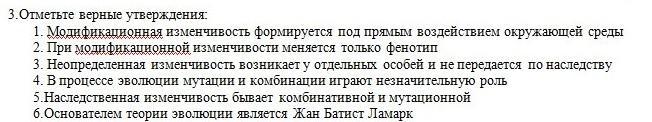 3.Отметьте верные утверждения: 1. Модификационная изменчивость формируется под прямым воздействием окружающей среды 2. При модификационной изменчивости меняется только фенотип 3. Неопределенная изменчивость возникает у отдельных особей и не передается по наследству 4. В процессе эволюции мутации и комбинации играют незначительную роль 5. Наследственная изменчивость бывает комбинативной и мутационной 6.Основателем теории эволюции является Жан Батист Ламарк