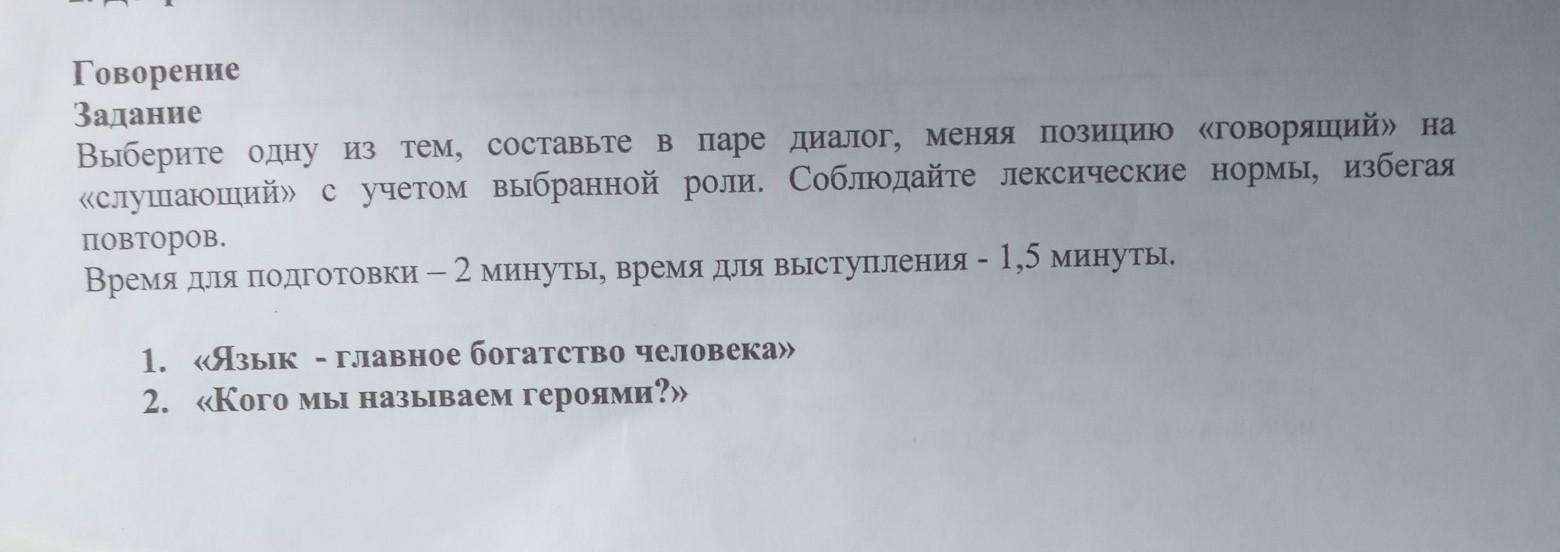 Говорение Задание Выберите одну из тем, составьте в паре диалог, меняя позицию «говорящий» на «слушающий» с учетом выбранной роли. Соблюдайте лексические нормы, избегая ПОВТОРОВ. Время для подготовки - 2 минуты, время для выступления - 1,5 минуты. 1. «Язык - главное богатство человека» 2. «Кого мы называем героями?»