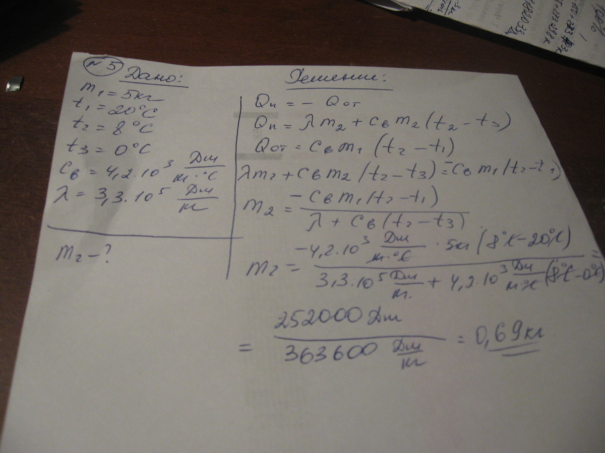 5.Чтобы охладить 5 кг воды,взятой при 20С до 8С в нее бросают лед,имеющий температуру 0С.Какое количество льда для этого потребуется?Удельная теплоемкость воды- 4,2*10^3Дж/кг,удельная теплота плавления льда- 3,3*10^5 Дж/кг.
