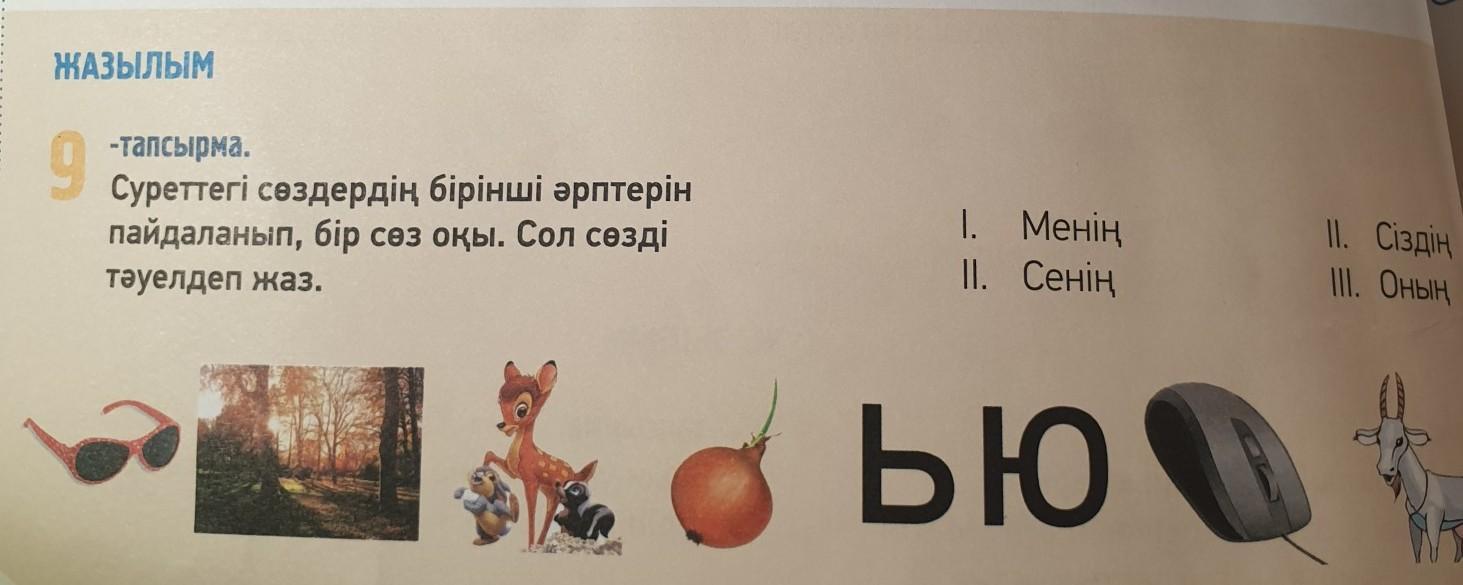 ЖАЗЫЛЫМ 9 -тапсырма. Суреттегі сөздердің бірінші әрптерін пайдаланып, бiр сез окы. Сол сезді тәуелдеп жаз. 16 I. II. Менің Сенің ЬЮ II. Сiздiң III. Оның. ПОЖАЛУЙСТА ПОЛНОСТЬЮ И ПОНЯТНО