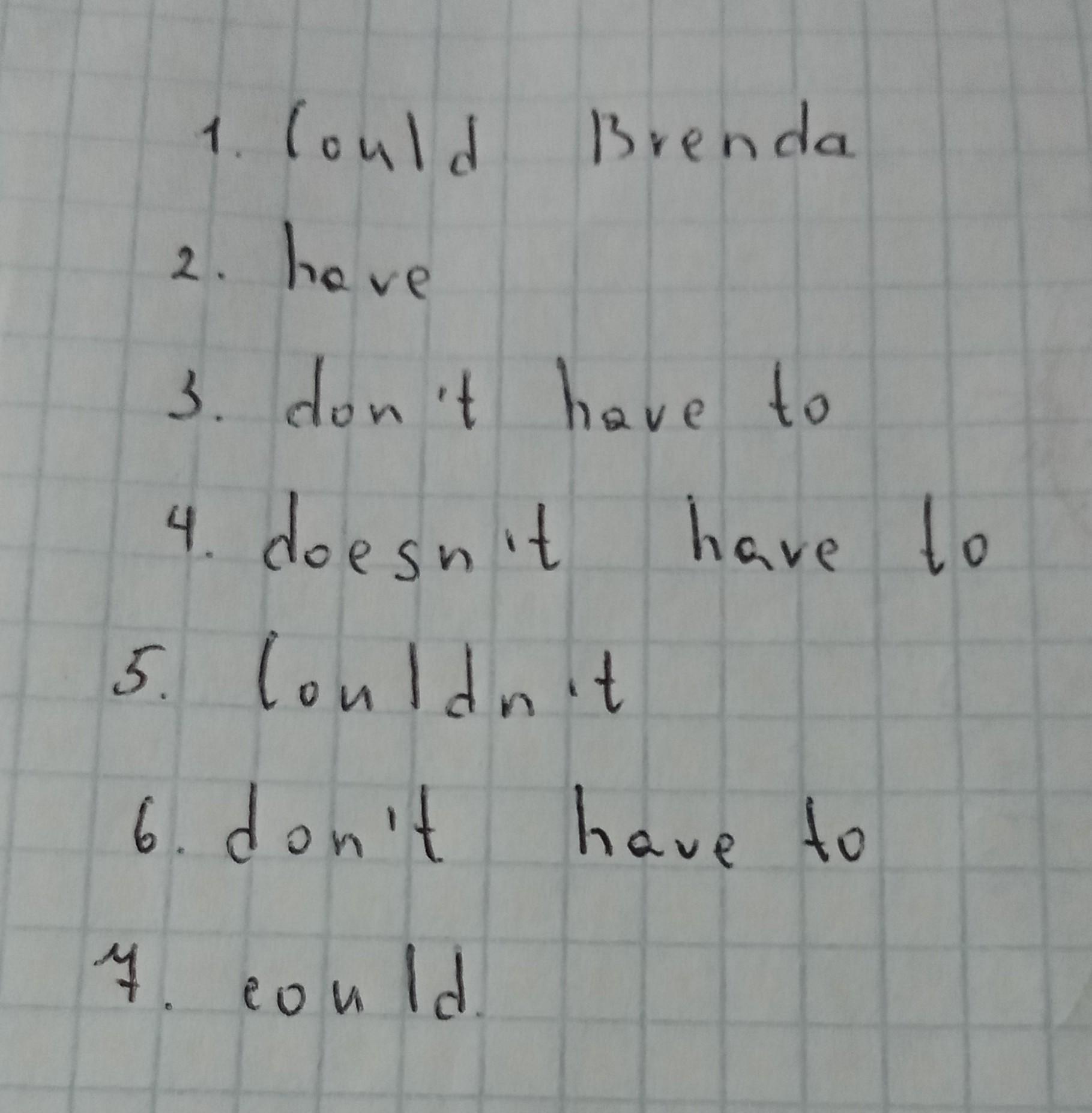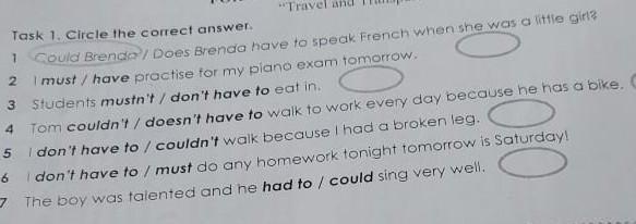 Task 1. Circle the correct answer. 1 Could Brenda / Does Brenda have to speak French when she was a little girl 2 I must / have practise for my plano exam tomorrow. 3 Students mustn't / don't have to eat in. 4 Tom couldn't / doesn't have to walk to work every day because he has a bike. C 5 I don't have to / couldn't walk because I had a broken leg. 6 I don't have to / must do any homework tonight tomorrow is Saturday! The boy was talented and he had to / could sing very well. 7