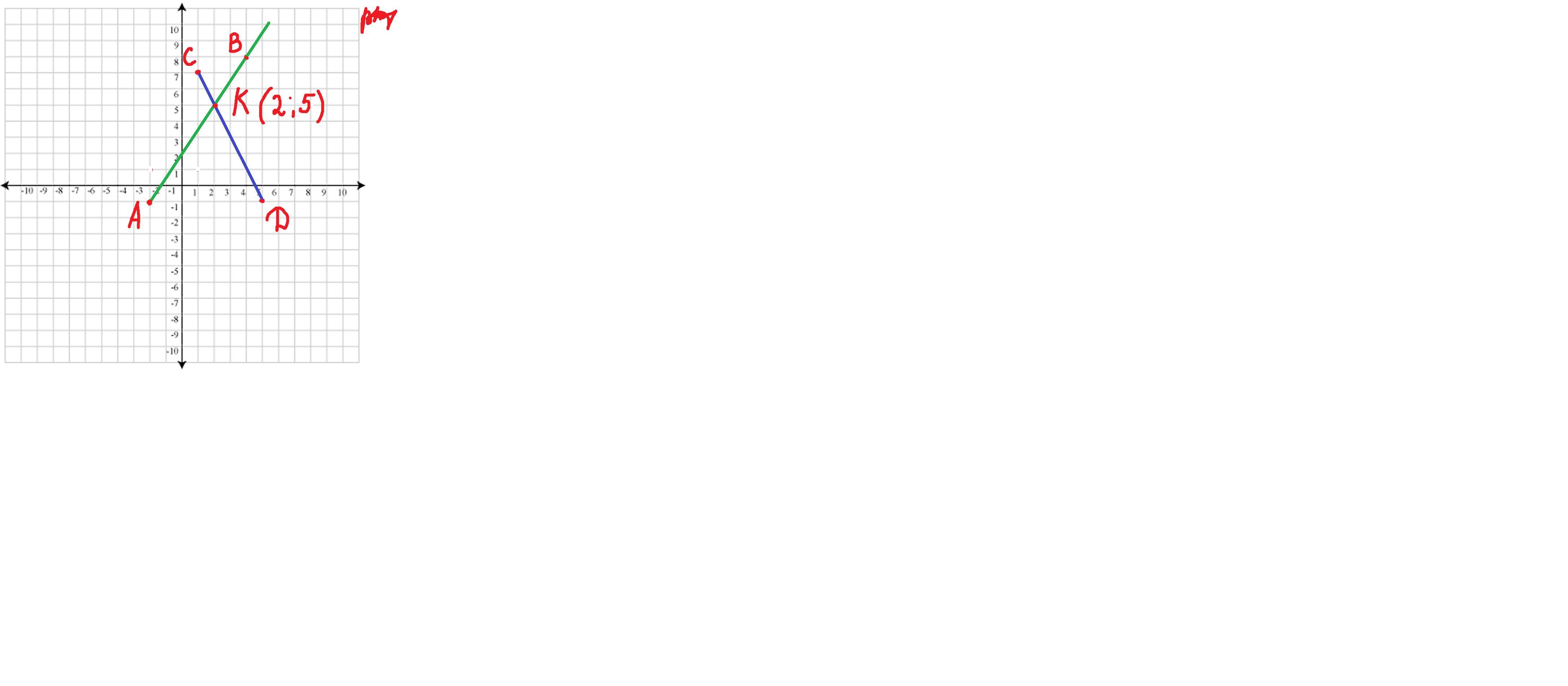 точка пересечения луча АВ и отрезка CD точка К(2;5)