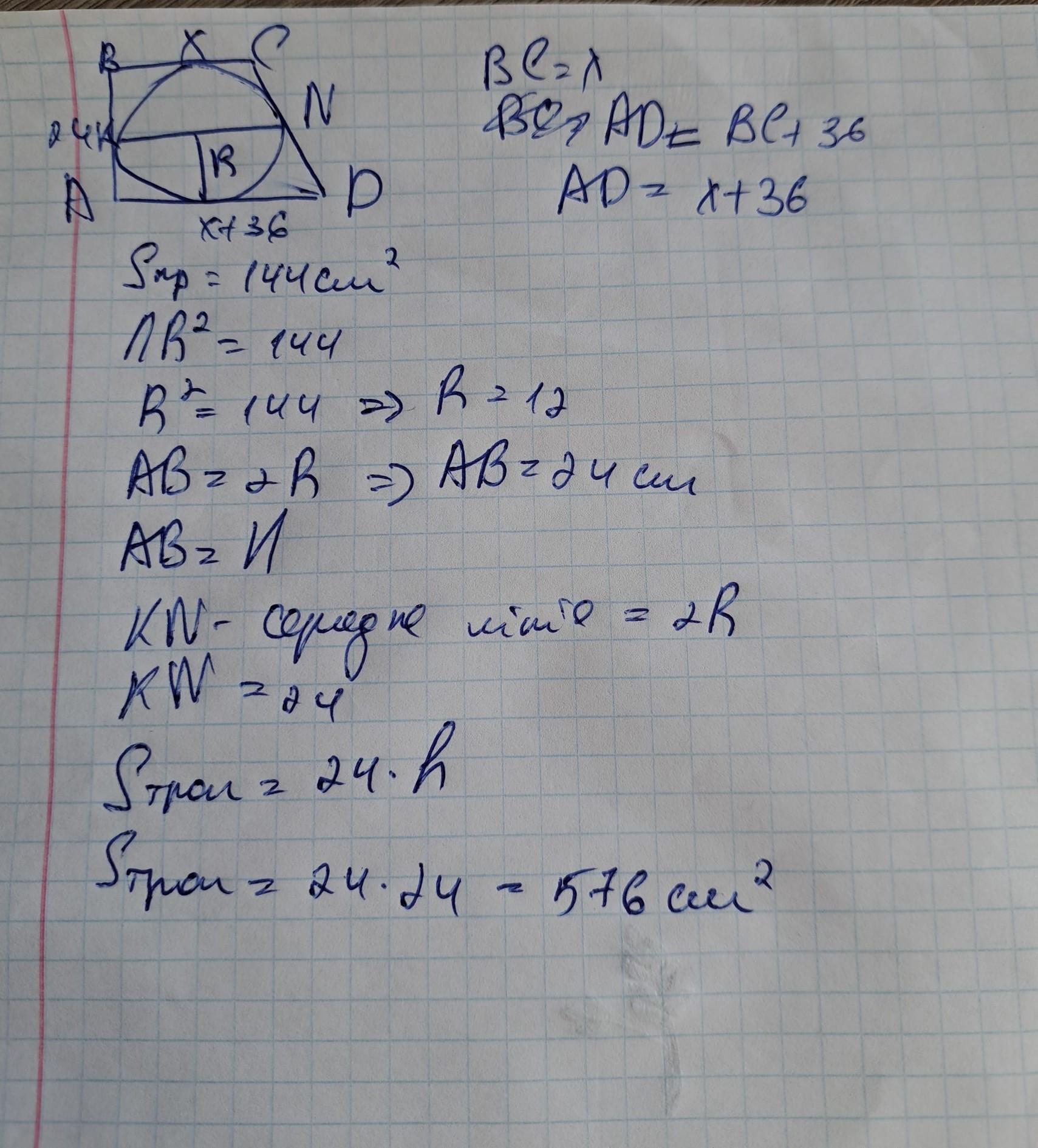 Площа круга, вписаного в прямокутну трапецію, дорівнює 144π см². Знайдіть площу трапеції, якщо її більша основа 36 см