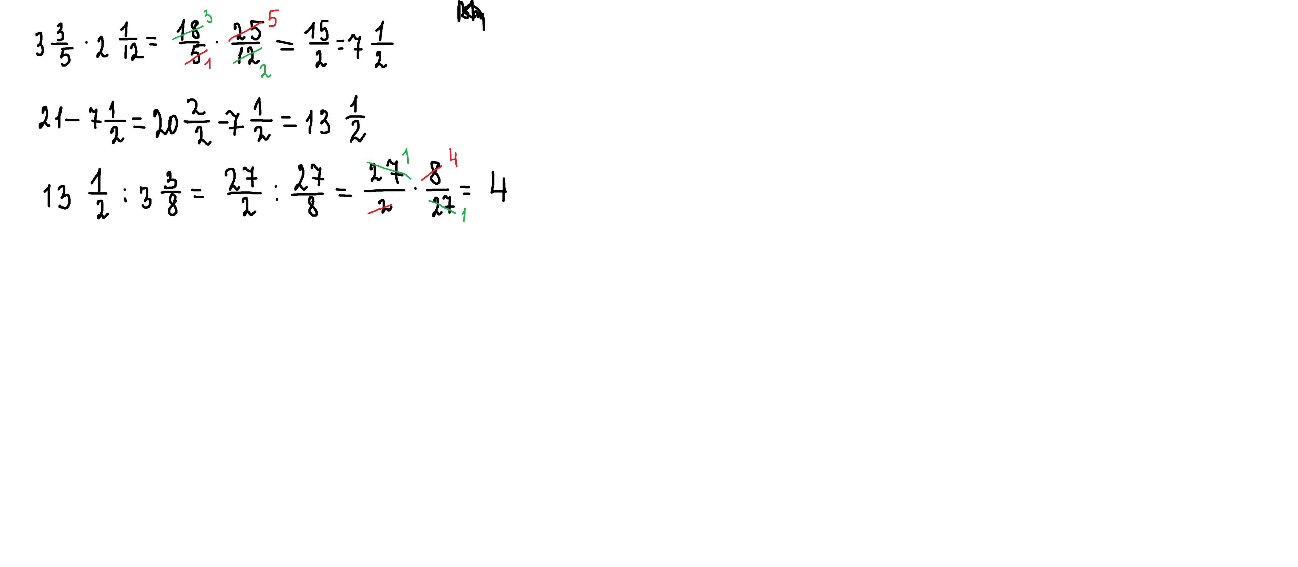 1) 3 3/5 * 2 1/12 = 18/5 * 25/12 = 3/1 * 5/2 = 15/2 = 7 1/2