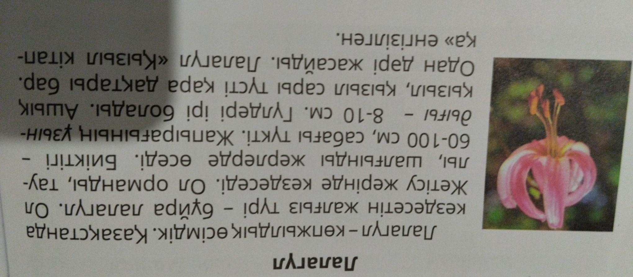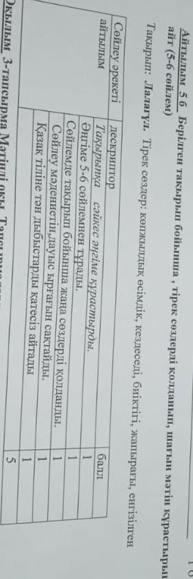 Айтылым 5 6 Берілген тақырып бойынша, тірек сөздердi колданып, шағын мәтін құрастырып айт (5-6 сөйлем) Такырып: Лалагүл. Тірек сөздер: көпжылдык өсімдік, кездеседi, биiктiгi, жапырағы, енгiзiлген Сөйлеу әрекеті айтылым дескриптор Тақырыпқа сәйкес әңгіме құрастырды. Әңгіме 5-6 сөйлемнен тұрады. Сейлемде такырып бойынша жаңа сөздерді қолданды. Сөйлеу мәдениетін,дауыс ыргагын сактайды. Қазақ тіліне тән дыбыстарды қатесіз айтады балл 1 1 1 1 1 5