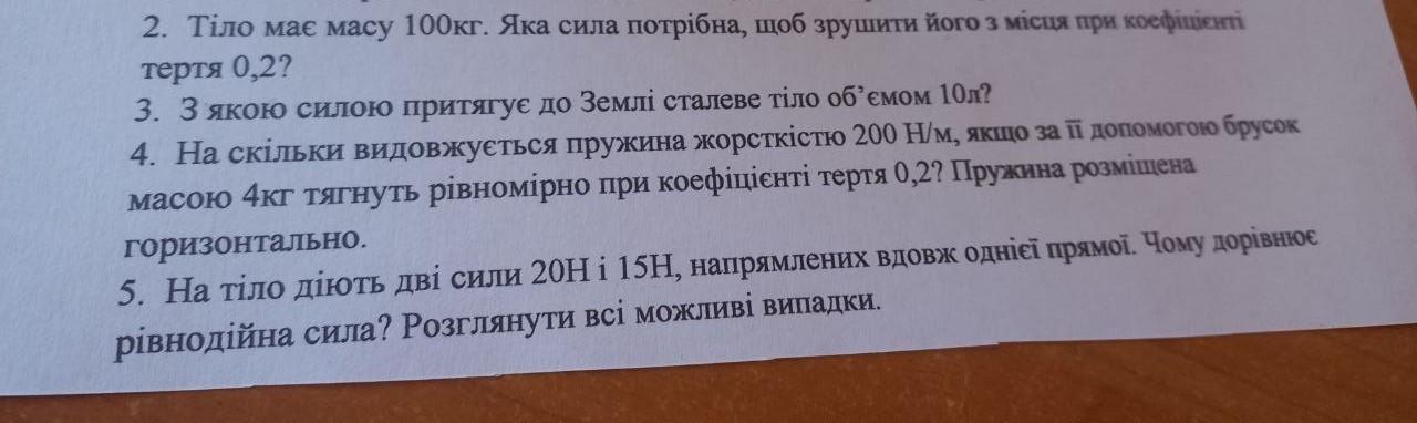 Тіло має масу 100кг. Яка сила потрібна, щоб зрушити його з місця при коефіцієнті тертя 0,2? 3. З якою силою притягує до Землі сталеве тіло об'ємом 10л? 4. На скільки видовжується пружина жорсткістю 200 Н/м, якщо за її допомогою брусок масою 4кг тягнуть рівномірно при коефіцієнті тертя 0,22 Пружина розміщена горизонтально. 5. На тіло діють дві сили 20Н і 15Н, напрямлених вдовж однієї прямої. Чому дорівнює рівнодійна сила? Розглянути всі можливі випадки.