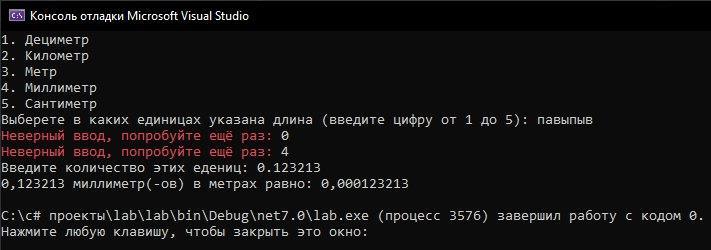 Console.Write("Выберете в каких единицах указана длина (введите цифру от 1 до 5): ");