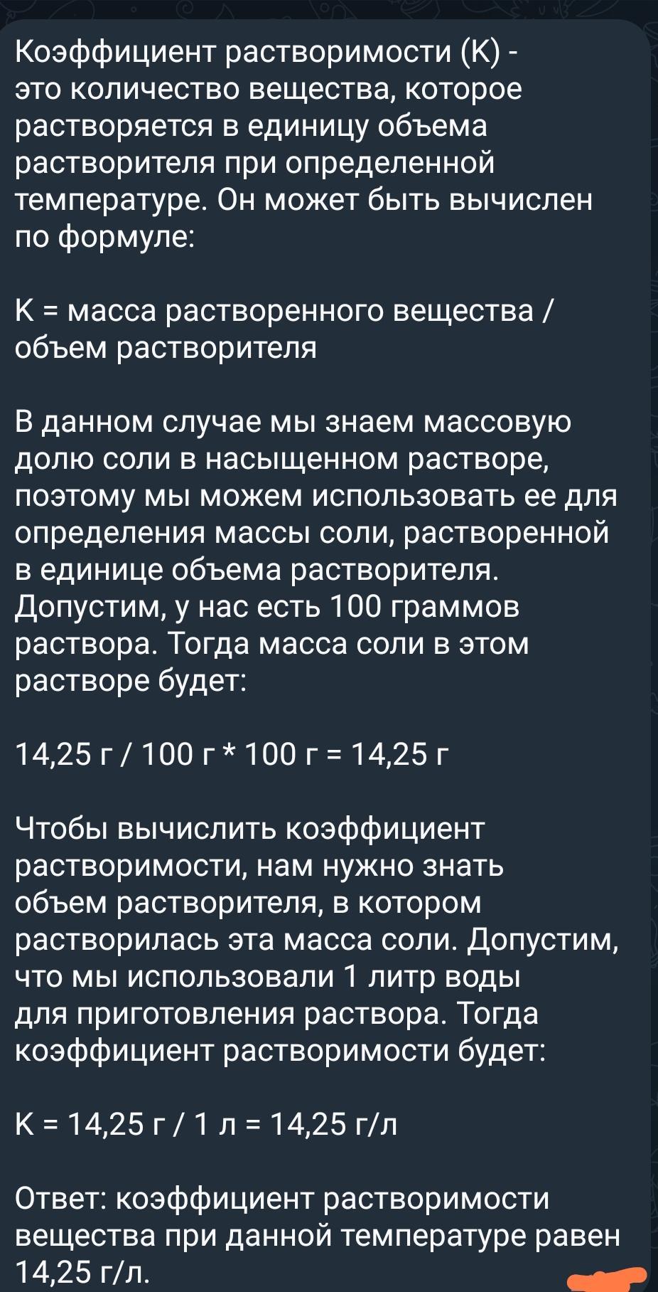 Массовая доля соли в насыщенном растворе при некоторой температуре равна 14,25%. Определите коэффициент растворимости вещества при этой температуре.