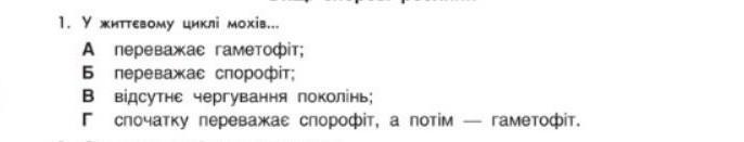 1. У життевому циклі мохів... А переважає гаметофіт; Б переважає спорофіт; в вiдсутне чергування поколінь; г спочатку переважає спорофіт, а потім - гаметофіт.