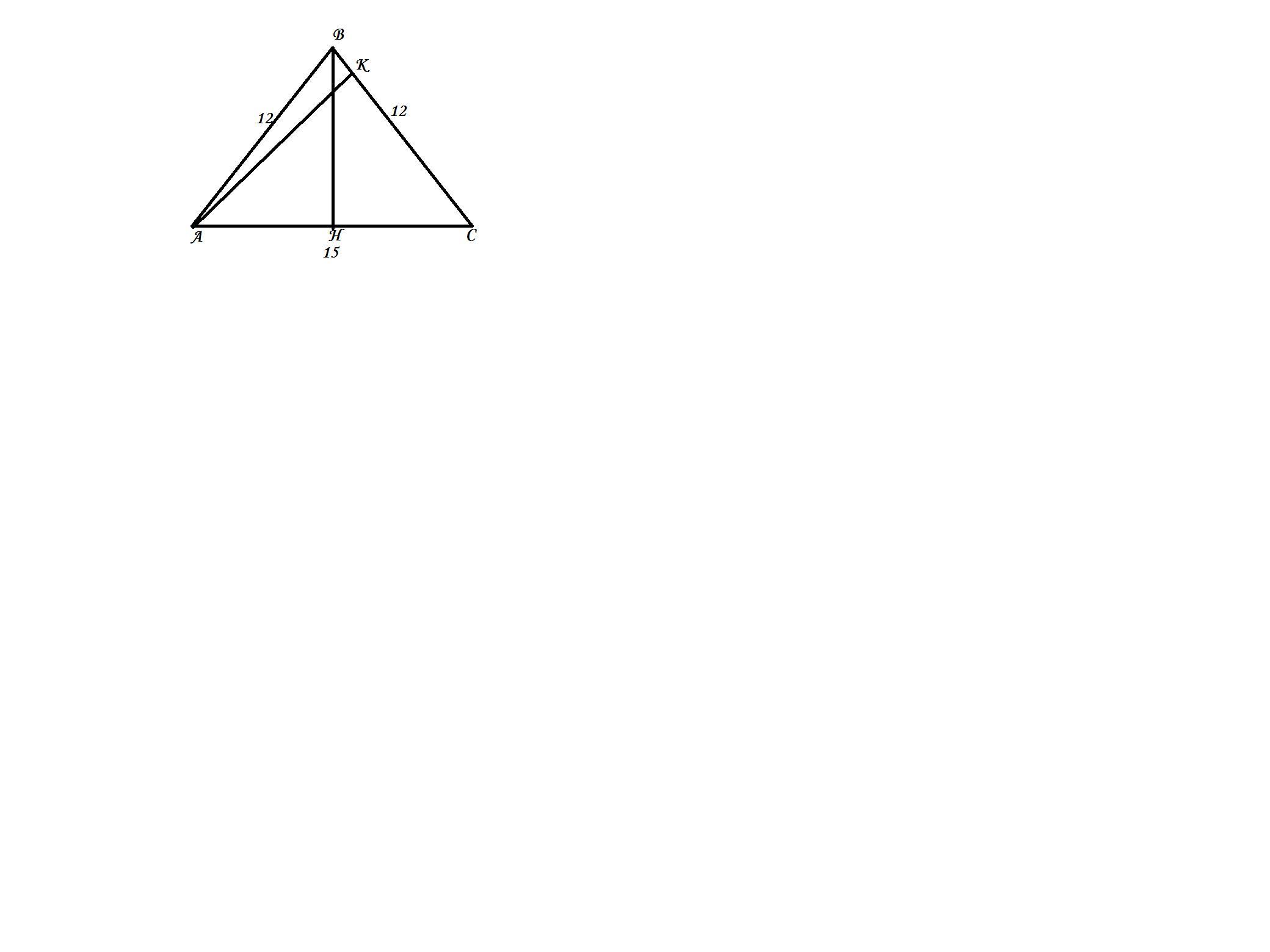 Дано: ΔАВС, АВ=ВС=12 см, АС=15 см.; ВН - высота, ВН=8 см. АК - ?
