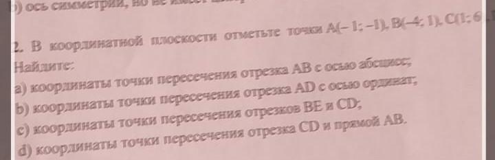 1) ось симметрии, но не 2. В координатной плоскости отметьте точки А(-1;-1), B(-41) C(1:6 Найдите: а) координаты точки пересечения отрезка АВ с осью абсцисс b) координаты точки пересечения отрезка AD с осью ординат с) координаты точки пересечения отрезков ВЕ и CD, d) координаты точки пересечения отрезка CD и прямой АВ