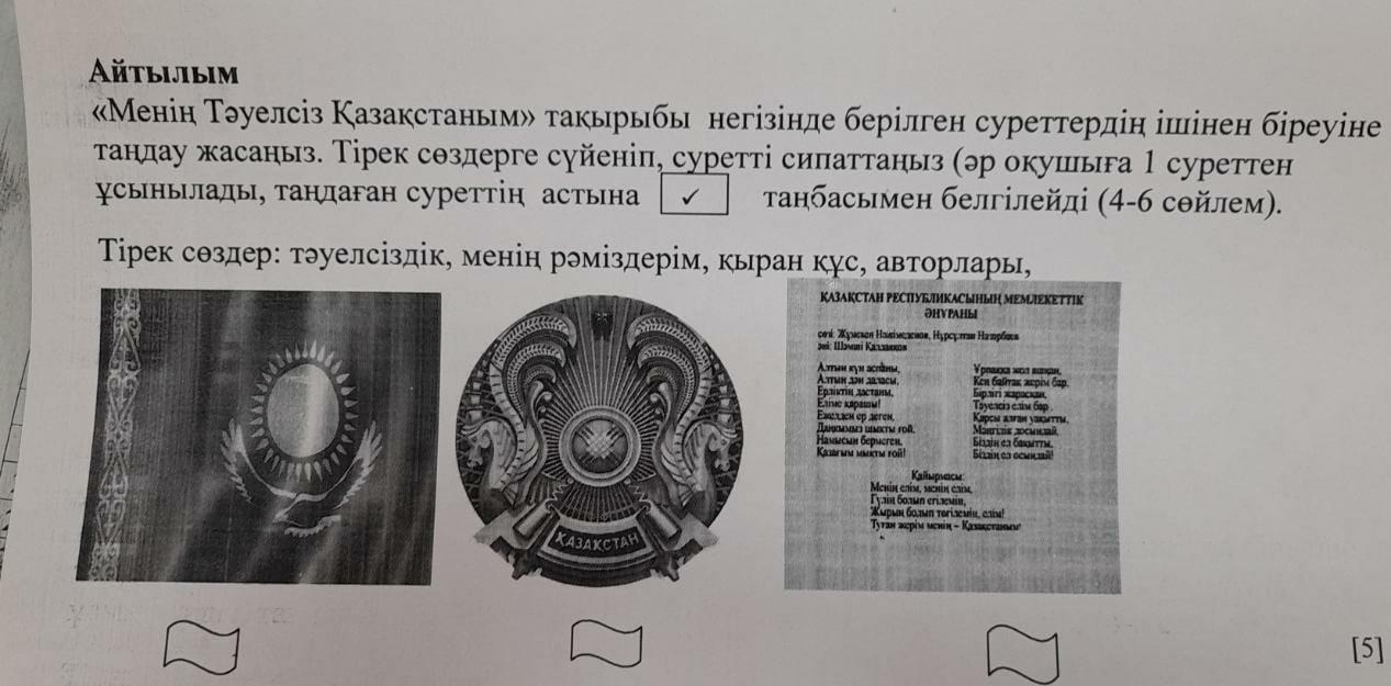 Айтылым «Менің Тәуелсіз Қазақстаным» такырыбы негiзiнде берілген суреттердiң iшiнен біреуіне таңдау жасаныз. Тірек сөздерге сүйеніп, суретті сипаттаңыз (әр оқушыға 1 суреттен ұсынылады, таңдаған суреттің астына танбасымен белгілейді (4-6 сөйлем). Тірек сөздер: тәуелсіздік, менің рәміздерім, қыран құс, авторлары, КАЗАКСТАН РЕСПУБЛИКАСЫНЫҢ МЕМЛЕКЕТТІК ӘНҰРАНЫ о КАЗАКСТАН П M co peas luni KaxMON Алтынасы, Алтын си Ерлiктiк дастаны, Eine kapaul Ежелан ер аген, Данкммма шыкты гой. Намысын берген KaarMM MMKTM roil Урн Кен байтак арым бар Бірлігі жараскан Tayeacis civ 6ap. Карти Mariais cucak Бетт Бос Кайырм Менің елім, менің елім Гуно, Ж Туган жерім менiн - Казакстаным о [57 ПОМОГИТЕЕЕЕЕЕ ПОЖАЛУСТООО