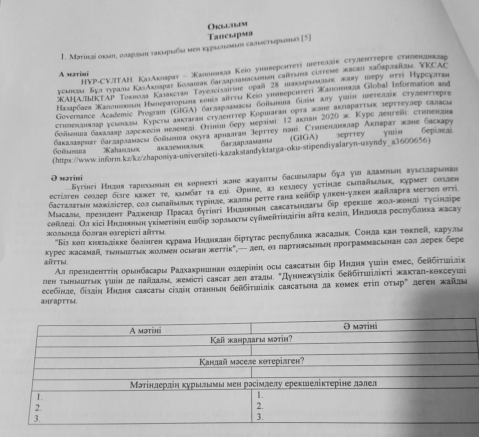 Ә мәтіні ...Бүгінгі Индия тарихының ең көрнекті және жауапты естілген сөздер бiзге кажет те, кымбат та еді. Әрине, аз кездесу үстінде сыпайылык, курмет басталатын мәжілістер, сол сыпайылык түрiнде, жалпы ретте ғана кейбір үлкен-үлкен жайларга мегзеп өттi. Мысалы, президент Раджендр Прасад бүгінгі Индияның саясатындағы бір ерекше жол-жөндi түсiндiре сөйледі. Ол кісі Индиянын үкіметінің ешбір зорлықты сүймейтіндігін айта келіп, Индияда республика жасау жолында болған өзгерісті айтты. "Біз көп князьдікке бөлінген құрама Индиядан біртұтас республика жасадық. Сонда кан төкпей, карулы күрес жасамай, тыныштық жолмен осыған жеттік", - деп, өз партиясының программасынан сәл дерек бере айтты. Ал президенттің орынбасары Радхакришнан өздерінің осы саясатын бір Индия үшін емес, бейбітшілік пен тыныштық үшін де пайдалы, жемiстi саясат деп атады. "Дүниежүзілік бейбітшілікті жақтап-көксеуші есебінде, біздің Индия саясаты сіздің отанның бейбітшілік саясатына да көмек етіп отыр" деген жайды аңғартты. 1. 2. 3. А мәтіні Қай жанрдағы мәтін? Қандай мәселе көтерілген? Ә мәтіні Мәтіндердің құрылымы мен рәсімделу ерекшеліктеріне дәлел 2. 3.