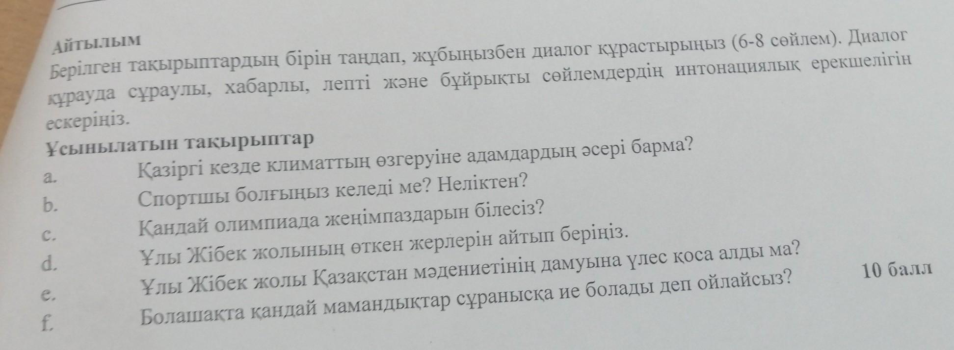 Айтылым Берілген тақырыптардың бiрiн тандап, жубынызбен диалог құрастырыныз (6-8 сөйлем). Диалог курауда сұраулы, хабарлы, лептi және бұйрыкты сөйлемдердiн интонациялык ескерiнiз. ерекшелігін Ұсынылатын такырыптар b. d. e. f. Қазiргi кезде климаттын өзгеруiне адамдардың әсері барма? Спортшы болгыныз келедi ме? Неліктен? Кандай олимпиада женiмпаздарын бiлесiз? Ұлы Жібек жолының өткен жерлерiн айтып беріңіз. Ұлы Жібек жолы Казакстан мәдениетiнiн дамуына үлес коса алды ма? Болашакта кандай мамандыктар сұранысқа ие болады деп ойлайсыз? 10 балл ге ашулы. бай. Каза. аяулы к ны тур ка ак кен.
