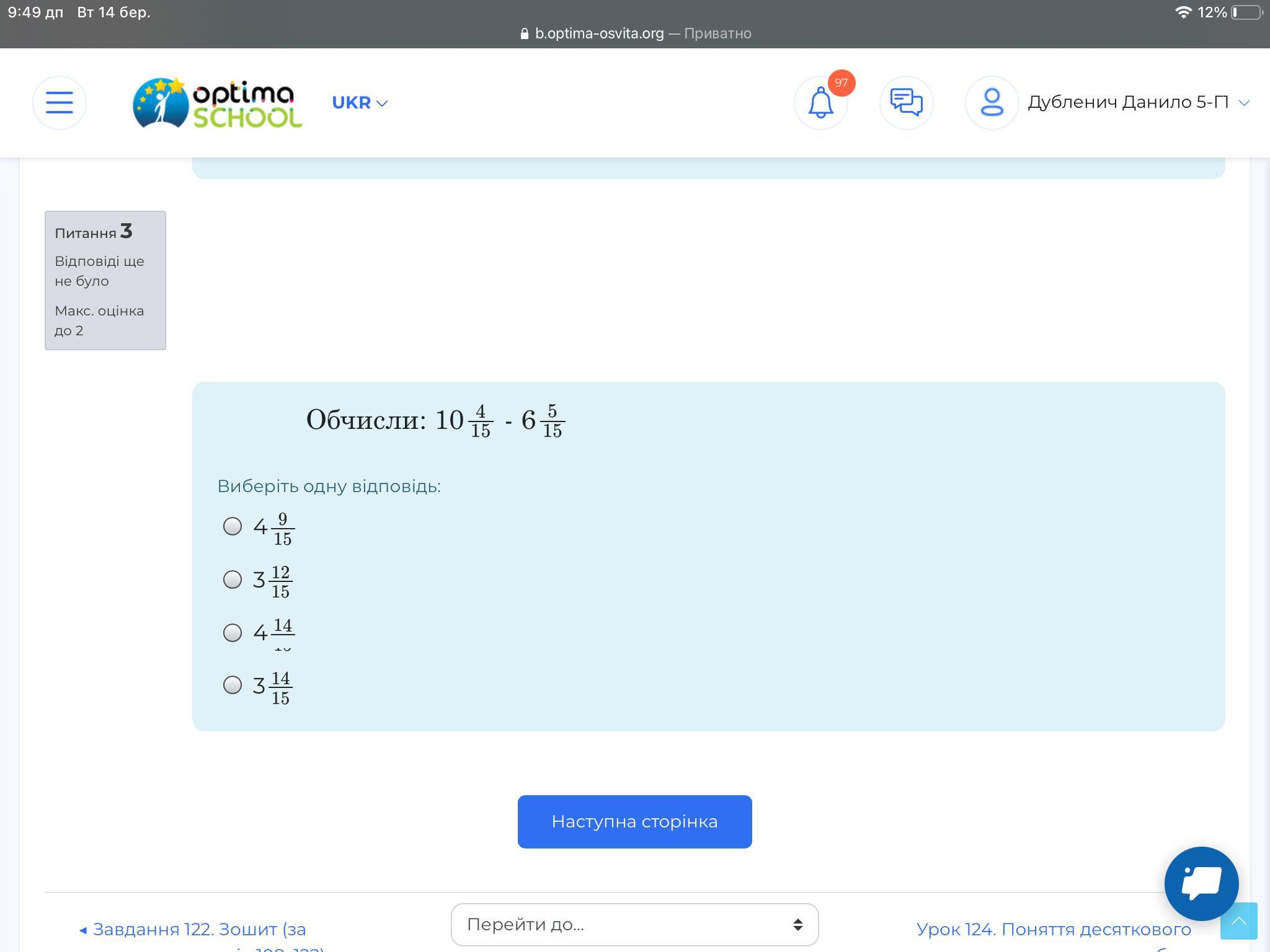 10 4/15 - 6 5/15 = 3 14/15