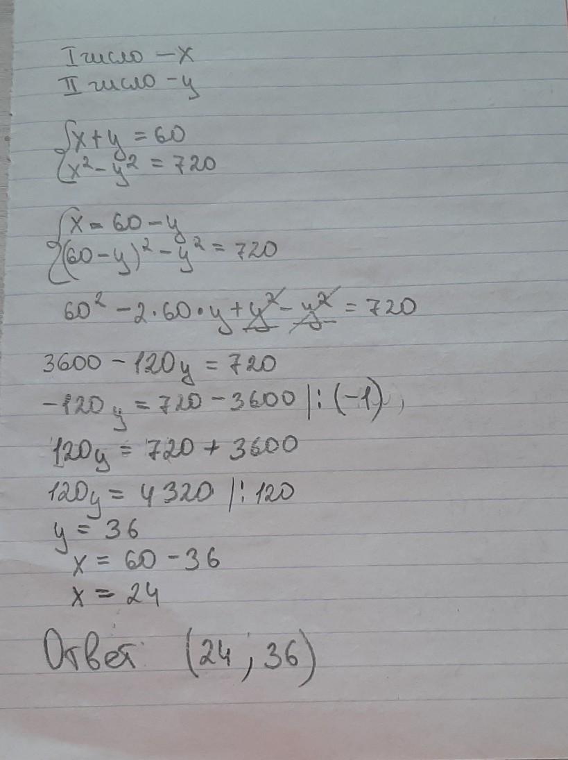 Решите задачу с помощью составления уравнения. Сумма двух чисел равна 60,а разность их квадратов 720. Найдите эти числа