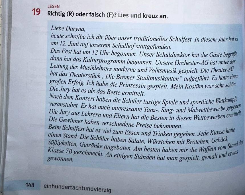 ich hoffe, es geht dir gut. Heute möchte ich dir von unserem Schulfest erzählen, das jedes Jahr in unserer Schule stattfindet. Es nennt sich "Tag der offenen Tür" und wird jedes Jahr am letzten Samstag im März veranstaltet.
