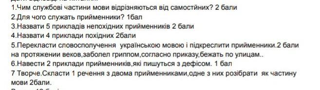 1.Чим службові частини мови відрізняються від самостйних? 2 бали 2.Для чого служать прийменники? 1бал 3.Назвати 5 прикладів непохiдних прийменників 2 бали 4.Назвати 4 приклади похідних 2бали 5.Перекласти словосполучення українською мовою і підкреслити прийменники.2 бали на протяжении веков, заболел гриппом,согласно приказу,бежать по улицам.. 6.Навести 2 приклади прийменників,які пишуться з дефісом. 1 бал 7 Творче.Скласти 1 речення з двома прийменниками,одне з них розібрати як частину мови 2 бали. помогите пожалуйста..