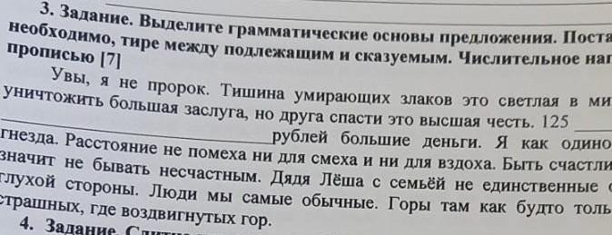 3. Задание. Выделите грамматические основы пред необходимо, тире между подлежащим и сказуемым. Чи прописью [7] Увы, я не пророк. Тишина умирающих злаков эт уничтожить большая заслуга, но друга спасти это высшая гнезда. Расстояние не помеха ни для смеха и ни для вздох рублей большие деньги. значит не бывать несчастным. Дядя Лёша с семьёй не глухой стороны. Люди мы самые обычные. Горы там страшных, где воздвигнутых гор.