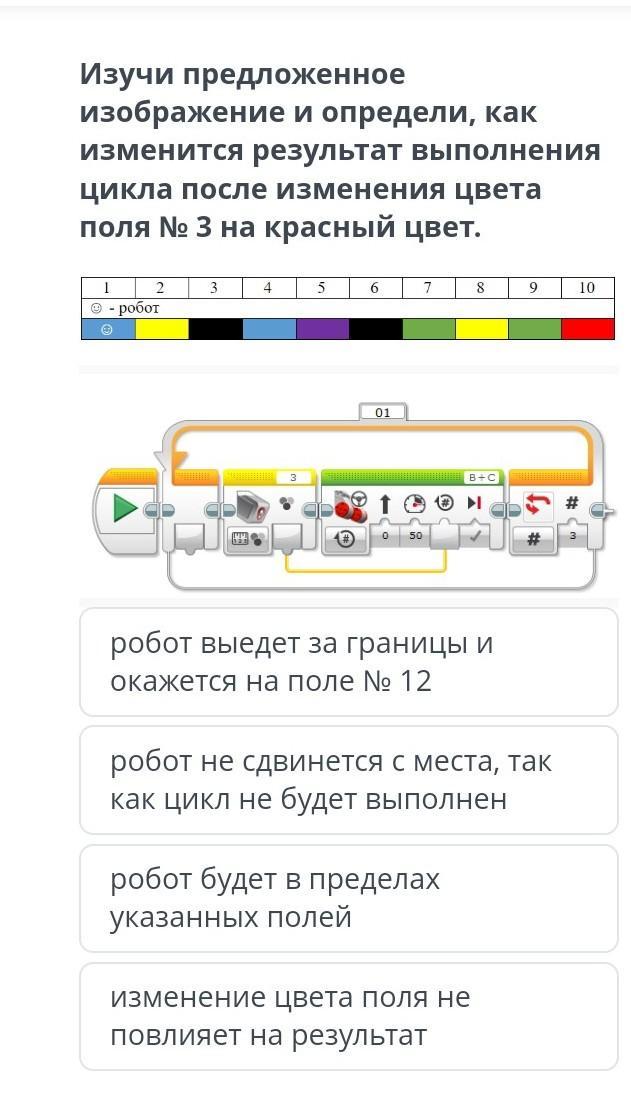 Изучи предложенное изображение и определи, как изменится результат выполнения цикла после изменения цвета ПОЛЯ № 3 на красный цвет. 2 I - робот 3 4 5 6 01 0 7 50 8 B+C робот будет в пределах указанных полей ▶ робот выедет за границы и окажется на поле № 12 робот не сдвинется с места, так как цикл не будет выполнен изменение цвета поля не повлияет на результат 9 10