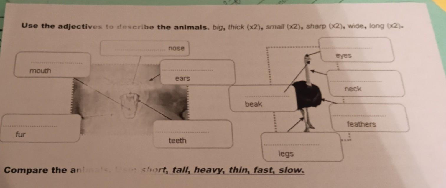Use the adjectives to describe the animals, big, thick (x2), small (x2), sharp (x2), wide, long (x2). fur mouth 10 nose ears teeth beak legs Compare the animals. Use short, tall, heavy, thin, fast, slow. eyes neck feathers очень Ну ПРОСТО ОЧЕНЬ СРОЧНО НАДО ДАЮ 25БАЛЛЛЛОВВВВВВВВВВВВВВВВВВВВВВВВВВВВВВВВВВВВ