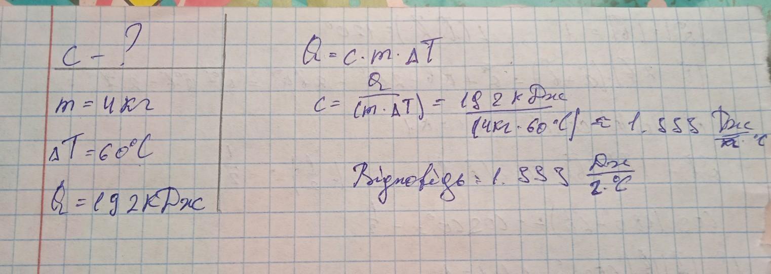 4. Чому дорівнює питома теплоємність цегли масою 4 кг, якщо при її охолодженні на 60 °C виділилося 192 кДж теплоти?