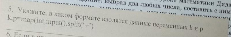 Данные переменных k и p вводятся в формате строки (str) с помощью функции input(). Функция input() возвращает введенную пользователем строку, которую мы передаем в функцию split() для разделения на отдельные строки (по умолчанию, разделитель - пробел). Затем, каждый элемент полученного списка строк мы передаем в функцию map(), где производим конвертацию в целое число (int) и возвращаем их в виде итерируемого объекта map.