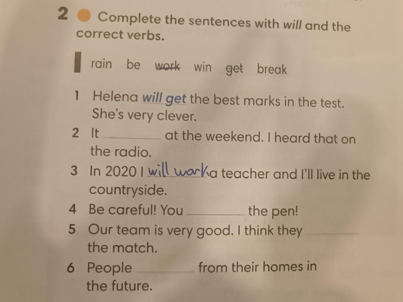 2 Complete the sentences with will and the correct verbs. rain be work win get break 1 Helena will get the best marks in the test. She's very clever. at the weekend. I heard that on 2 It the radio. 3 In 20201 countryside. 4 Be careful! You the pen! 5 Our team is very good. I think they the match. 6 People a teacher and I'll live in the the future. from their homes in
