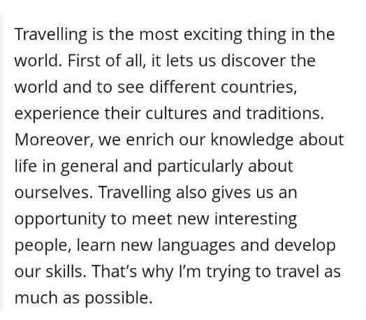 Travelling is the most exciting thing in the world. First of all, it lets us discover the world and to see different countries, experience their cultures and traditions. Moreover, we enrich our knowledge about life in general and particularly about ourselves. Travelling also gives us an opportunity to meet new interesting people, learn new languages and develop our skills. That’s why I’m trying to travel as much as possible.
