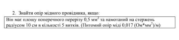 2. Знайти опiр iдного провідника, якщо: Він має площу поперечного перерізу 0,5 мм² та намотаний на стержень радіусом 10 см в кількості 5 витків. (Питомий опір міді 0,017 (Ом*мм²/м)
